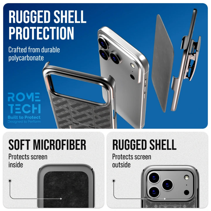 Rome Tech's Apple iPhone 17 Pro Max case with belt clip offers reliable phone protection with its superior craftsmanship and high-quality materials. Meticulously manufactured, the case provides excellent defense against scratches, impacts, and other potential damage. With its combination of quality materials and stylish aesthetics, Rome Tech ensures that your device is not only protected but also looks great.