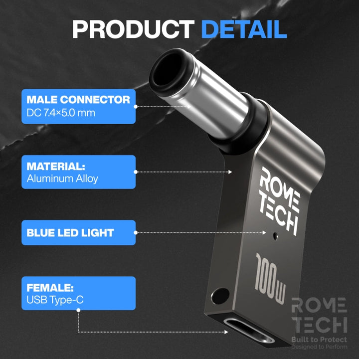 • USB Type-C to DC 7.4 x 5.0 mm Jack Plug Converter - Female USB Type-C to Male 7.4 x 5.0 mm. 100W connector plug that can connect laptop to a power delivery AC adapters, so you can use your power delivery charger cable with your laptop as well as your cell phone.