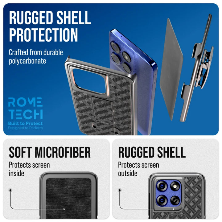 Rome Tech's Motorola Moto G Stylus 5G case with belt clip offers reliable phone protection with its superior craftsmanship and high-quality materials. Meticulously manufactured, the case provides excellent defense against scratches, impacts, and other potential damage. With its combination of quality materials and stylish aesthetics, Rome Tech ensures that your device is not only protected but also looks great.