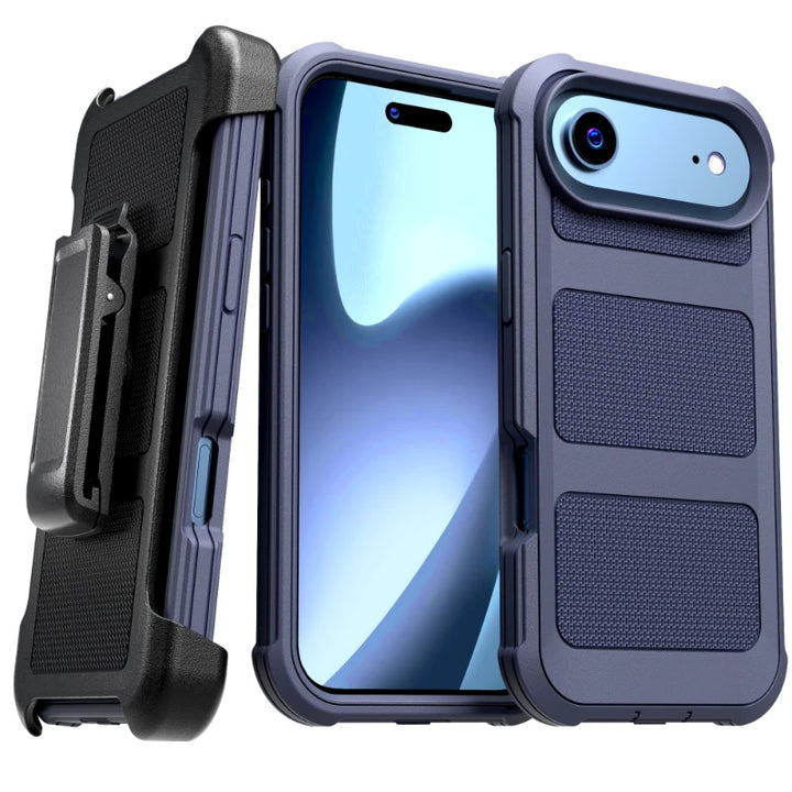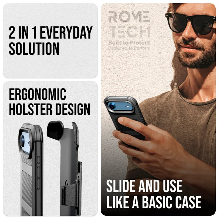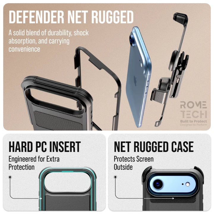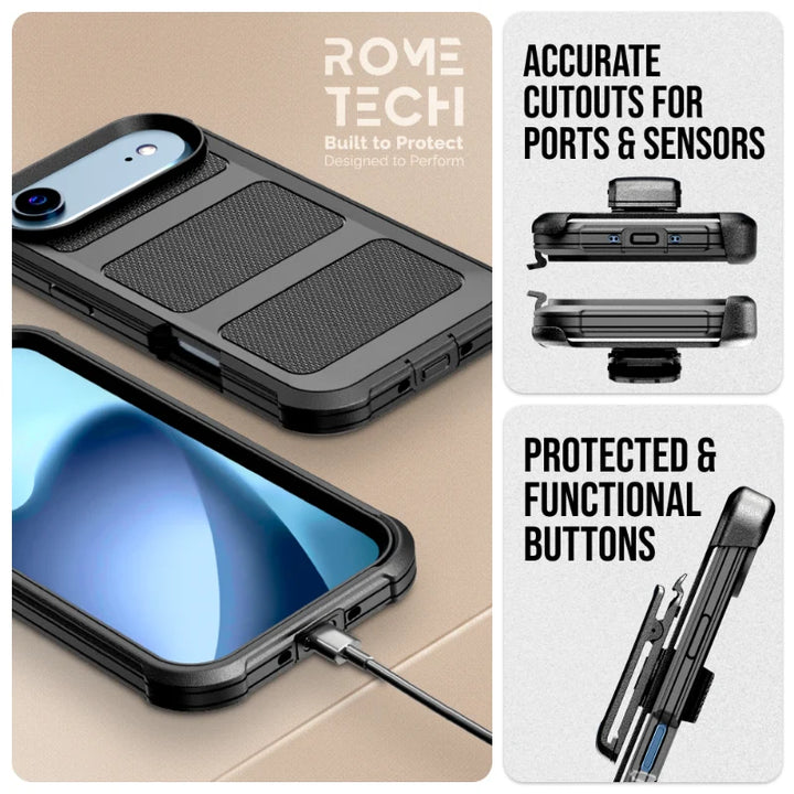 Protective Cases for Apple iPhone 17 Air a is four layers of 360-degree heavy-duty shockproof protection. Our defender case is made out of durable materials with a hard polycarbonate inner shell and soft outer rubber layer. Raised beveled edge keeps your touchscreen safe from scratches. A 360-degree swivel belt clip also functions as a kickstand with different viewing angles perfect for video calls and media playback. Defender case also have easy access to the charging port, buttons, sensors, and camera. Built-in port covers offer protection from dust, dirt, and other elements, making it ideal for commercial use. Rome Tech's Defender case multi-layer design offers rugged drop protection ideal for outdoor adventures, sports, hiking and guards your device against scrapes, bumps, dirt, and dust.