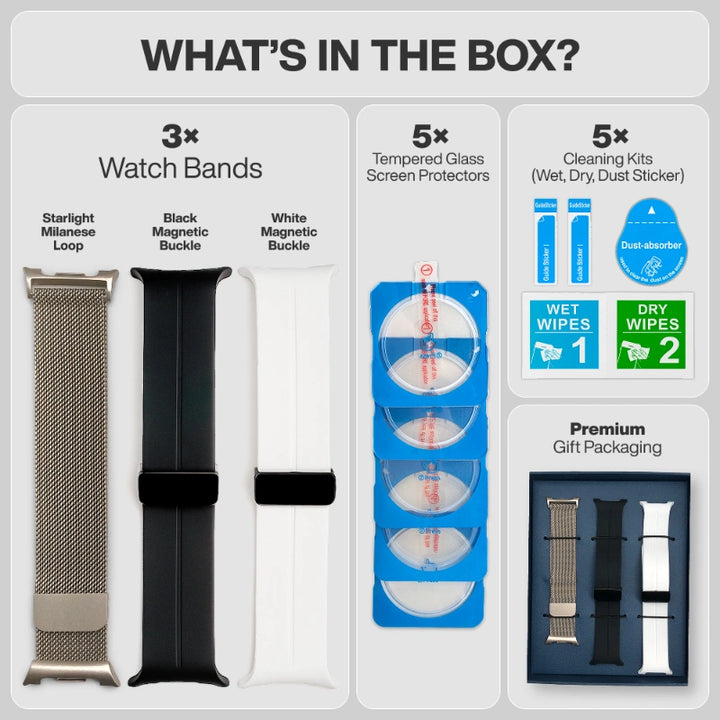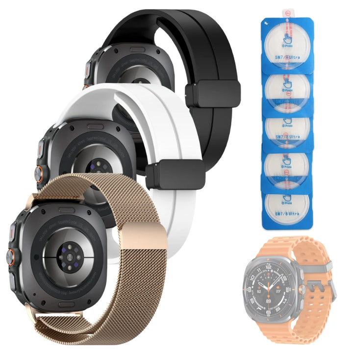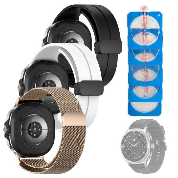 Premium Accessory Set for Samsung Galaxy Watch Series (8 / 8 Classic / Ultra)Upgrade your Samsung Galaxy Watch with our all-in-one accessory kit — the perfect combination of protection, comfort, and style. Each set is precisely designed to fit your specific watch model and includes everything you need for daily wear and long-lasting screen protection.What’s Included: