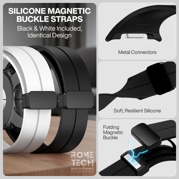- 3× Premium Watch Bands — two magnetic silicone straps (black & white) for sport and casual wear, plus a third interchangeable strap for your preferred style: